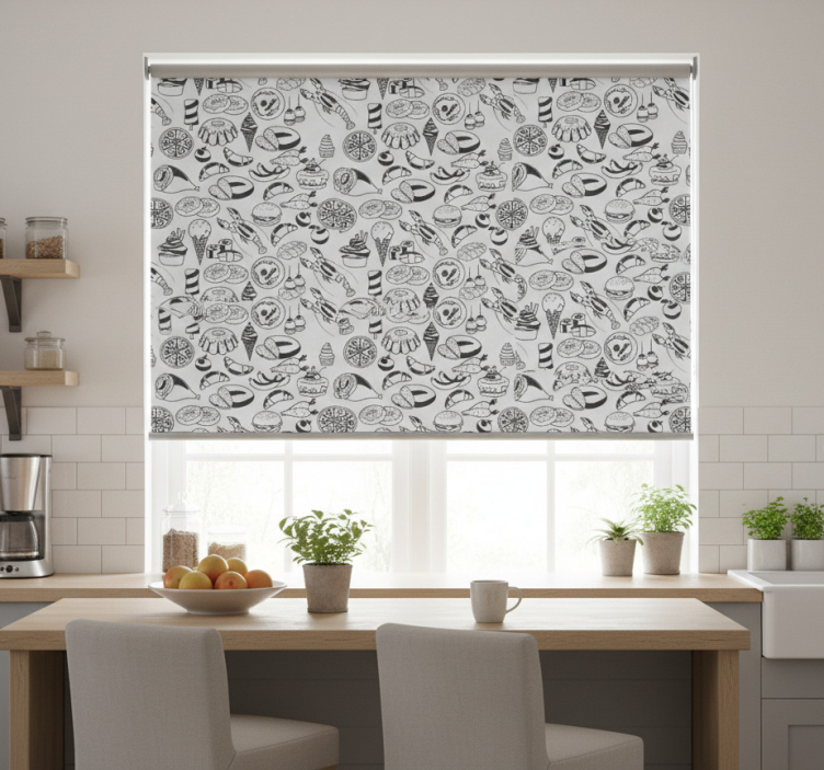 Riferimento: E6487Scopri la tenda a rullo cucina motivo doodle alimentare, un accessorio di design che trasforma il tuo spazio! Con un vivace motivo doodle ispirato al mondo culinario, questa tenda è caratterizzata da colori brillanti, una stampa divertente e uno stile moderno che si adatta perfettamente a qualsiasi cucina. Ogni dettaglio è pensato per portare una ventata di freschezza e allegria nel tuo ambiente domestico!