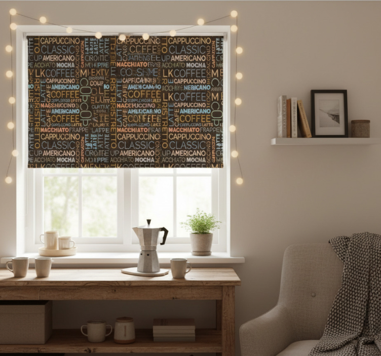 Riferimento: E6508La tenda a rullo cucina motivo testo caffè è un elemento decorativo dal design accattivante e moderno, caratterizzata da un motivo vivace che rappresenta il mondo del caffè, con tonalità calde e accoglienti che si integrano perfettamente in qualsiasi cucina. Questo prodotto è realizzato con materiali di alta qualità, offre un facile montaggio in 2 clic, è facile da pulire e consente un facile smontaggio, rendendo la manutenzione della tua finestra un gioco da ragazzi.