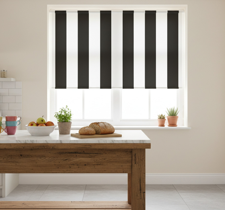 Riferimento: E6474La tenda a rullo cucina righe bianche e nere è l'elemento di design perfetto per arricchire il tuo spazio! Con il suo stile moderno e accattivante, questa tenda presenta un motivo a righe eleganti che si adattano facilmente a qualsiasi arredamento, garantendo un'illuminazione naturale ideale grazie alla sua capacità di filtrare la luce solare diretta e offrendo al contempo un'ottima privacy.