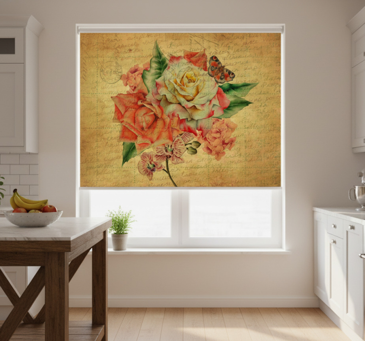 Tenda a rullo cucina rose con farfalle e scritte