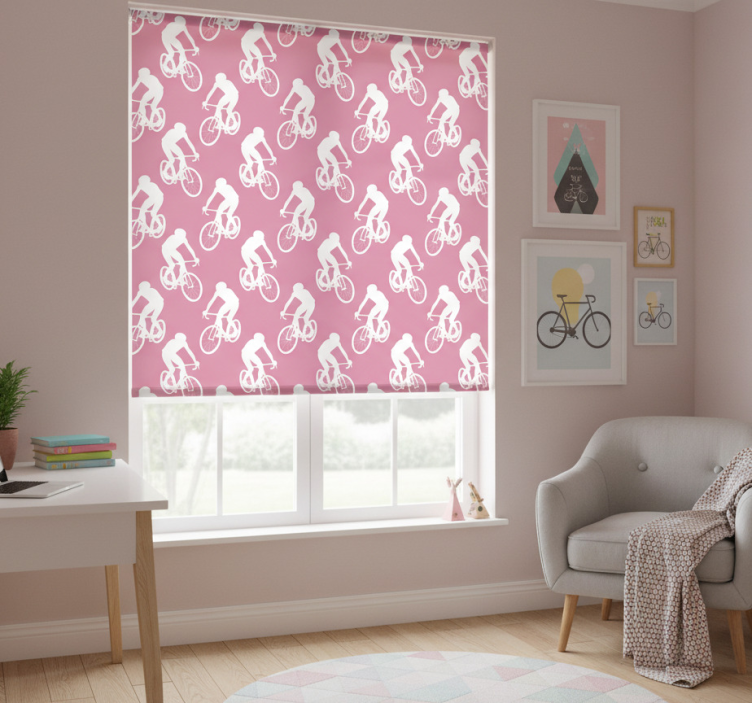Tenda a rullo rosa motivo ciclisti bianchi