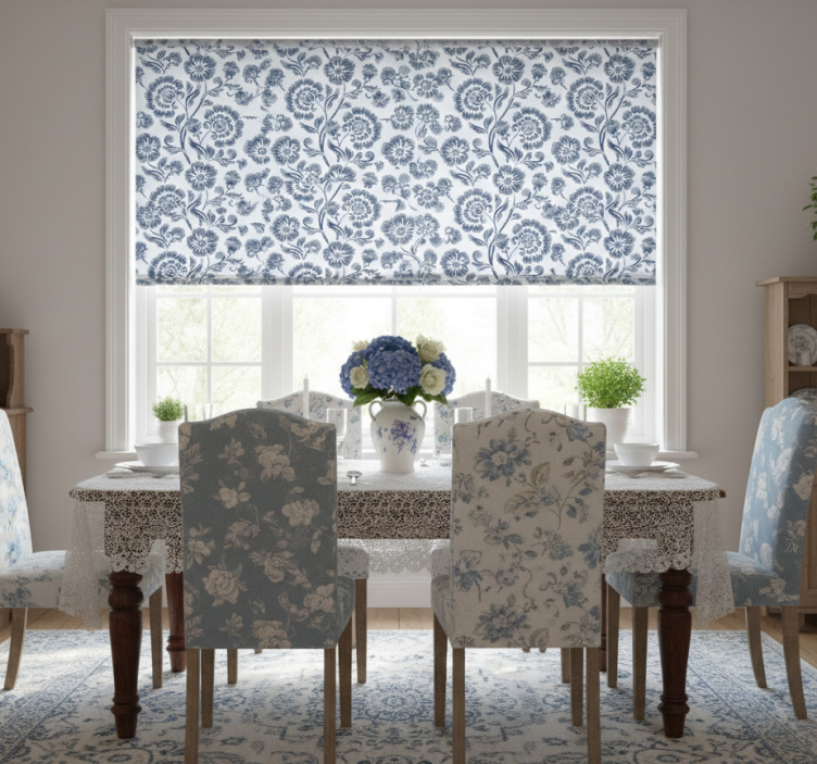 Tenda a rullo sala da pranzo motivo fiori blu grandmillenial