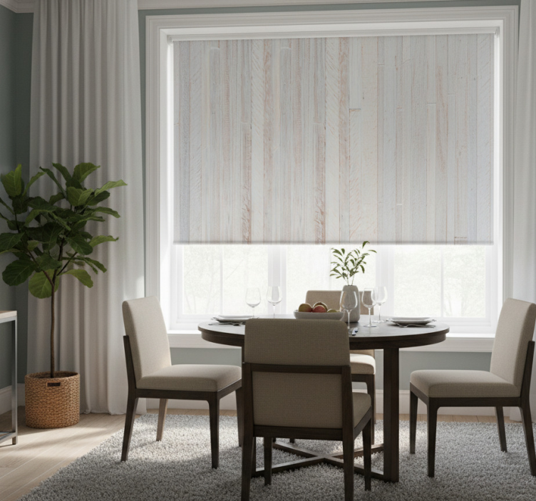 Tenda a rullo sala da pranzo motivo legno grigio elegante