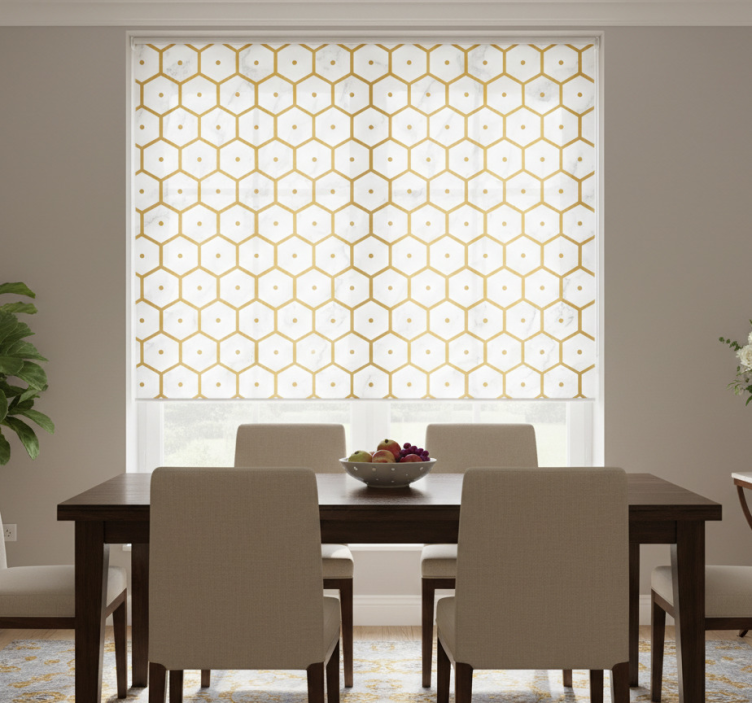 Tenda a rullo sala da pranzo motivo marmo oro esagonale