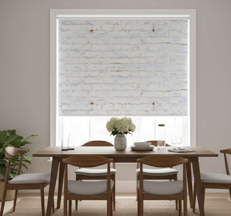 Tenda a rullo sala da pranzo motivo mattoni bianchi usurati