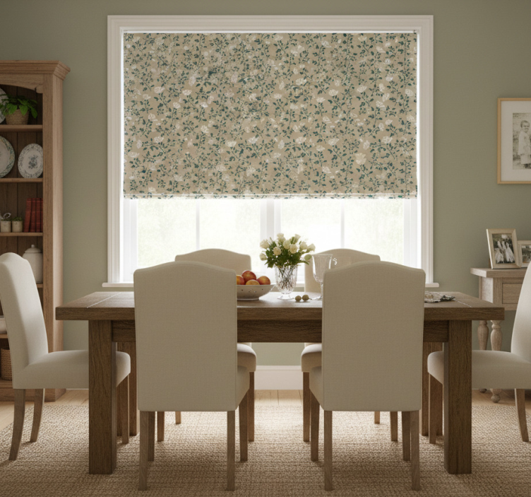Tenda a rullo sala da pranzo motivo rose vintage bianche